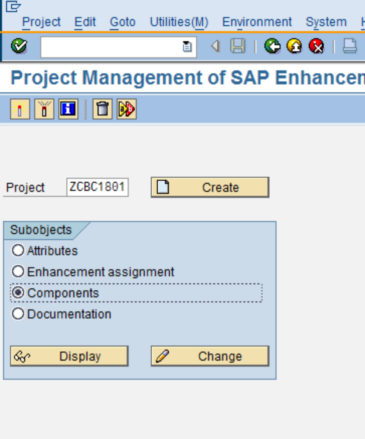 2. Insert project "ZCBC1801" that was made on "Function Module Exits" and then choose Radio button "Components"